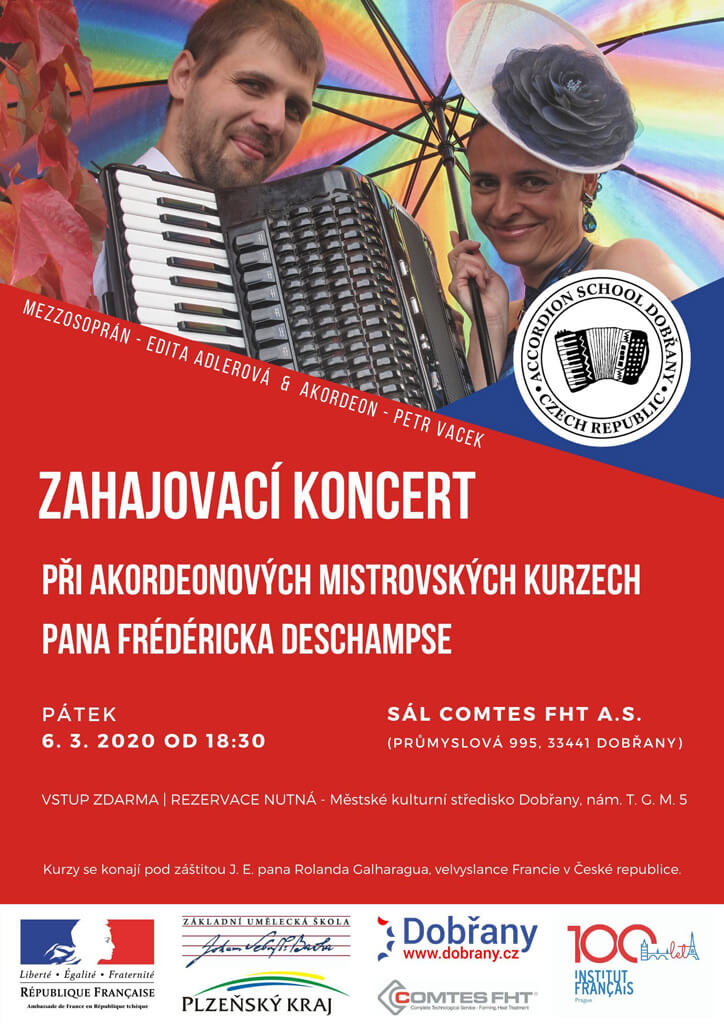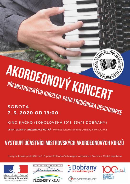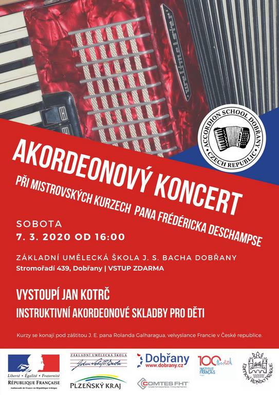 Velikou čest mělo město Dobřany ve dnech 6 – 8. března 2020. Pozvání na uspořádání mistrovských akordeonových kurzů přijal prezident celosvětové akordeonové asociace CMA pan Frédéric Deschamps z Francie. Jo to vůbec poprvé, co se mistrovské kurzy pod jeho vedením konaly v České republice a velká města mohou jen tiše závidět, že se to povedlo malému šestitisícovému městečku na jižním Plzeňsku. O osobnosti pana Deschampse vypovídá fakt, že byl celý tento projekt podpořen ambasádou Francie v České republice a byla mu udělena záštita pana velvyslance JE (jeho excelence) pana Rolanda Galharagua. V průběhu mistrovských kurzů se vystřídalo v základní umělecké škole J. S. Bacha v Dobřanech okolo šedesáti akordeonistů z celé České republiky. Velmi prestižní byla tato akce právě pro aktivní účastníky mistrovských kurzů, protože z původních třiceti dvou přihlášek aktivních účastníků mohlo být přijato k mistrovskému studiu pouze 11 akordeonistů. Jednotliví kandidáti museli projít výběrem, kde nerozhodovalo pouze nadání a talent, ale také všechny soutěžní výsledky a jejich celkový přínos v propagaci akordeonu na národní i mezinárodní úrovni.